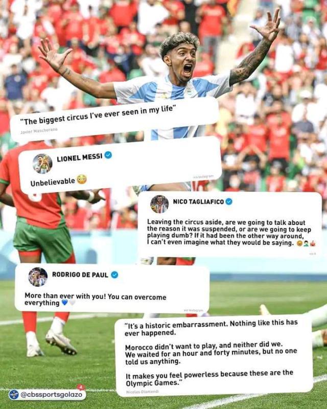 相比于比分,比赛补时阶段发生的一系列事件更让人感到不可思议,关注本场比赛的梅西也在赛后更新社交媒体表示:“难以置信。”阿根廷国奥队长奥塔门迪在赛后采访中表示:“我们都不想回去比赛了,摩洛哥队也不想,我从来没有遇到过1小时40分钟后才得到确认的判罚,我们全队无助地等了好久,但没有人告诉我们任何事情。”