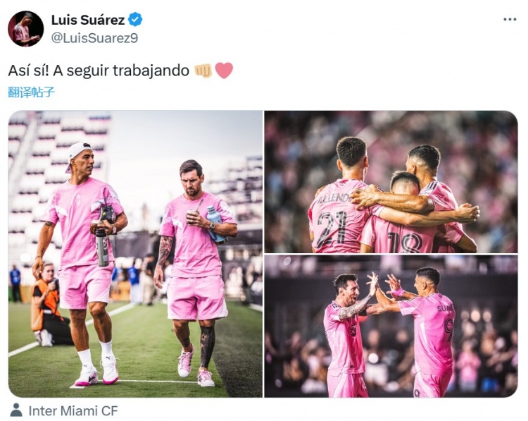 8月17日讯 美职联常规赛,迈阿密国际3-1战胜洛杉矶银河。赛后,苏亚雷斯在社交媒体晒图,庆祝球队获胜。